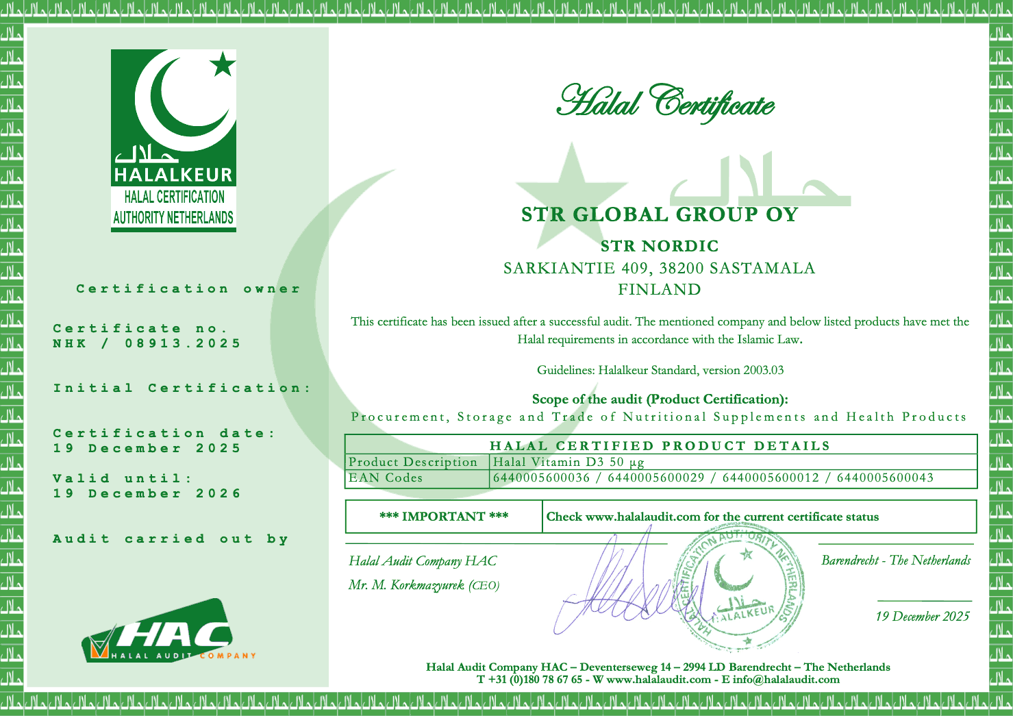 Certifieringen har beviljats STR Nordic (STR Global Group Oy) efter en godkänd revision genomförd av Halal Audit Company (HAC), Nederländerna.